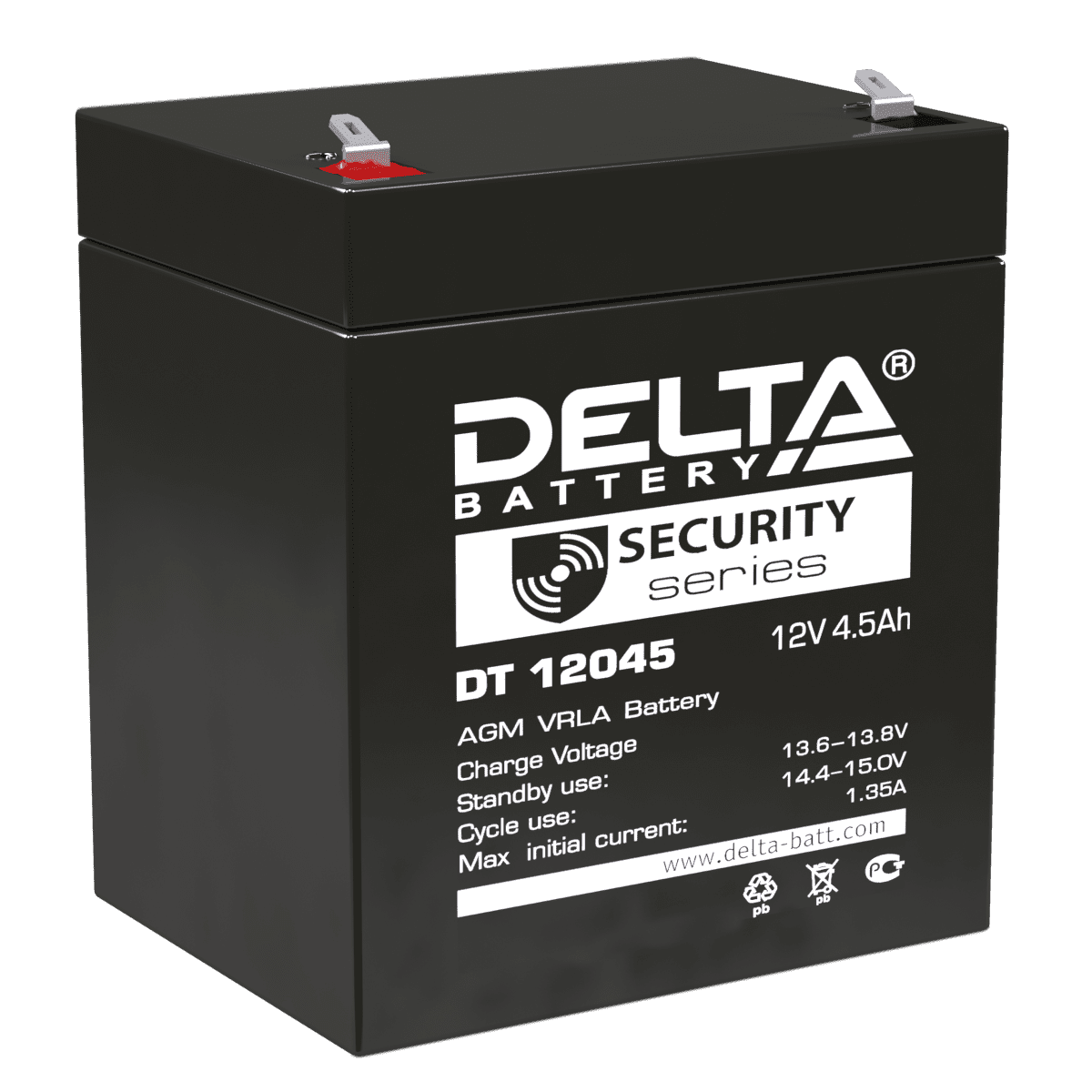 DT 12045 оснащен медными клеммами (высокая коррозионная стойкость) типа Faston (зажим) — ножевые, гнездо 4.8 мм. Рабочие температуры: разрядки — –15 ?С… +50 ?C, зарядки — –10 ?С… +50 ?C, рекомендуемые (для поддержания номинальных характеристик и длительного ресурса) — +20 ?С… +25 ?С. Материал корпуса и крышки — пластик ABS. Разрешена воздушная транспортировка. Размер — 90?70?101 мм. Высота по выводам — 107 мм. Вес — 1.6 кг.