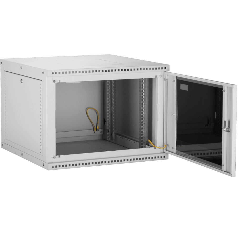 Телекоммуникационный шкаф TLK TWI-066045-R-G-GY настенной установки выполнен по ГОСТ 28601-90 и IEC 297 в типоразмере 19" с высотой 6 U (303 мм), полезной глубиной 430 мм и максимальным расстоянием между направляющими 332 мм.